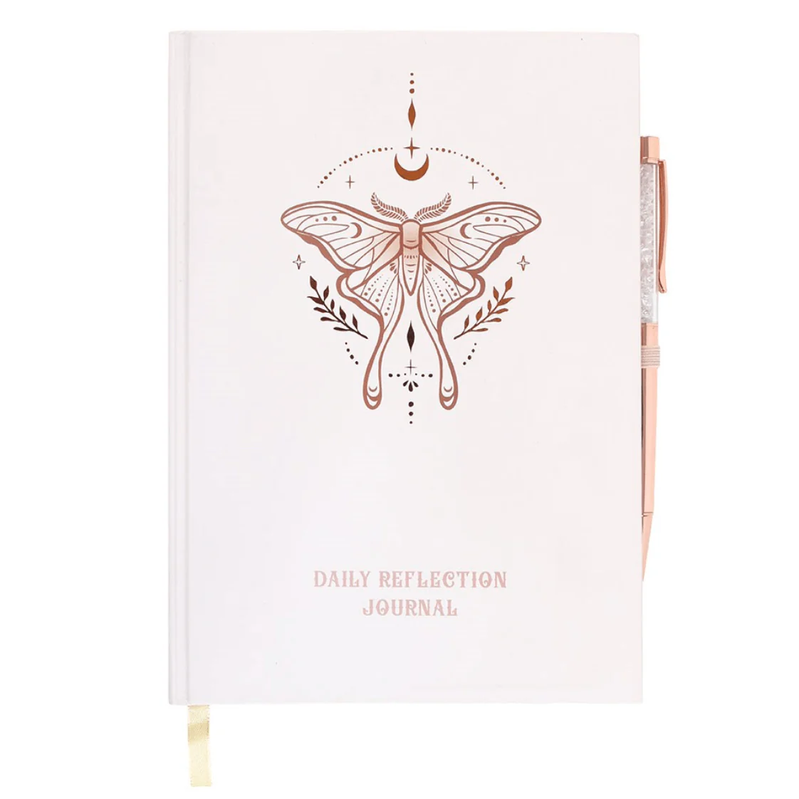Connect with your inner thoughts with this daily reflection journal. Take note of daily reflections, gratitude practices and the exploration of your dreams with a matching clear quartz pen for promoting clarity and positive energy. Featuring an elegant luna moth design which symbolises inner guidance and intuition, this journal is just what you need to manifest your best self.