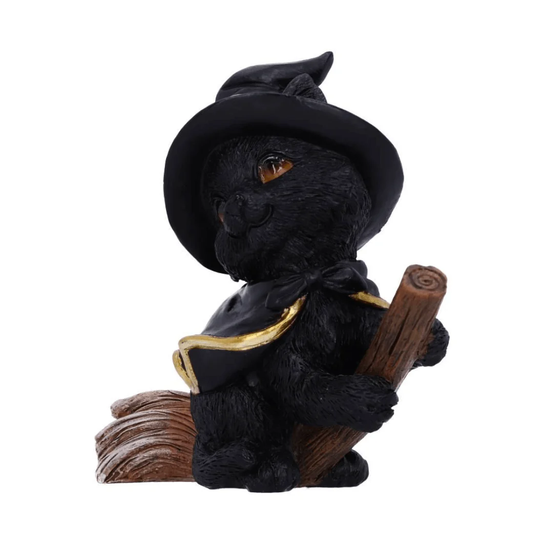 Cast from high-quality resin and lovingly hand-painted, the figurine highlights detailed fur textures and expressive features that bring this mischievous feline to life. The whimsical design makes this witchy cat ornament a delightful addition to shelves, desks, or seasonal displays.