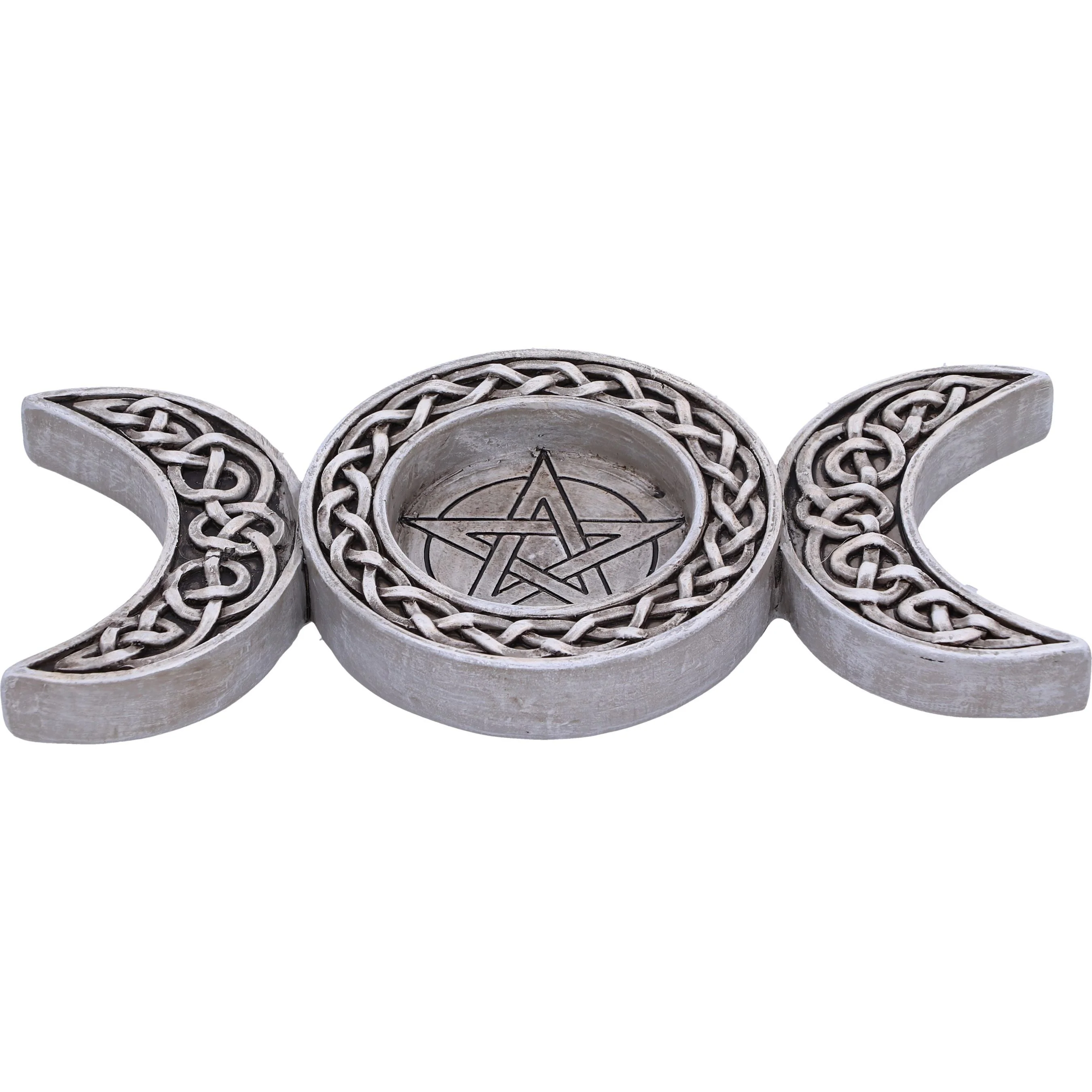 Cast in the finest polyresin, this grey wiccan tea light holder features a Celtic knot design around the edges and a black outline pentagram in the seat.